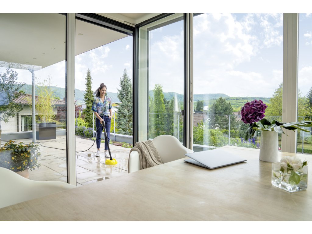 S tlakovou umývačkou K 2 Power Control môžete odstrániť nahromadené nečistoty z terasy, ako aj nečistoty nahromadené na bicykli, záhradnom nábytku alebo náradí. Výkonný motor s príkonom 1400 W vytvára silný prúd vody s teplotou až 40 °C.