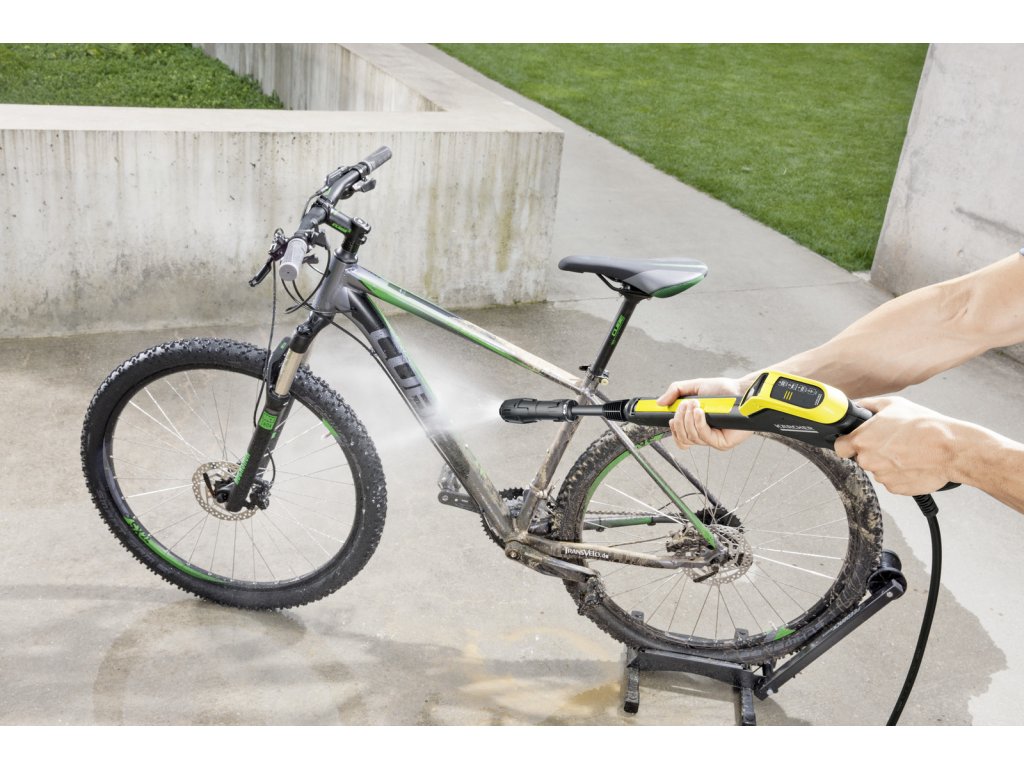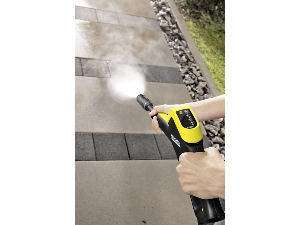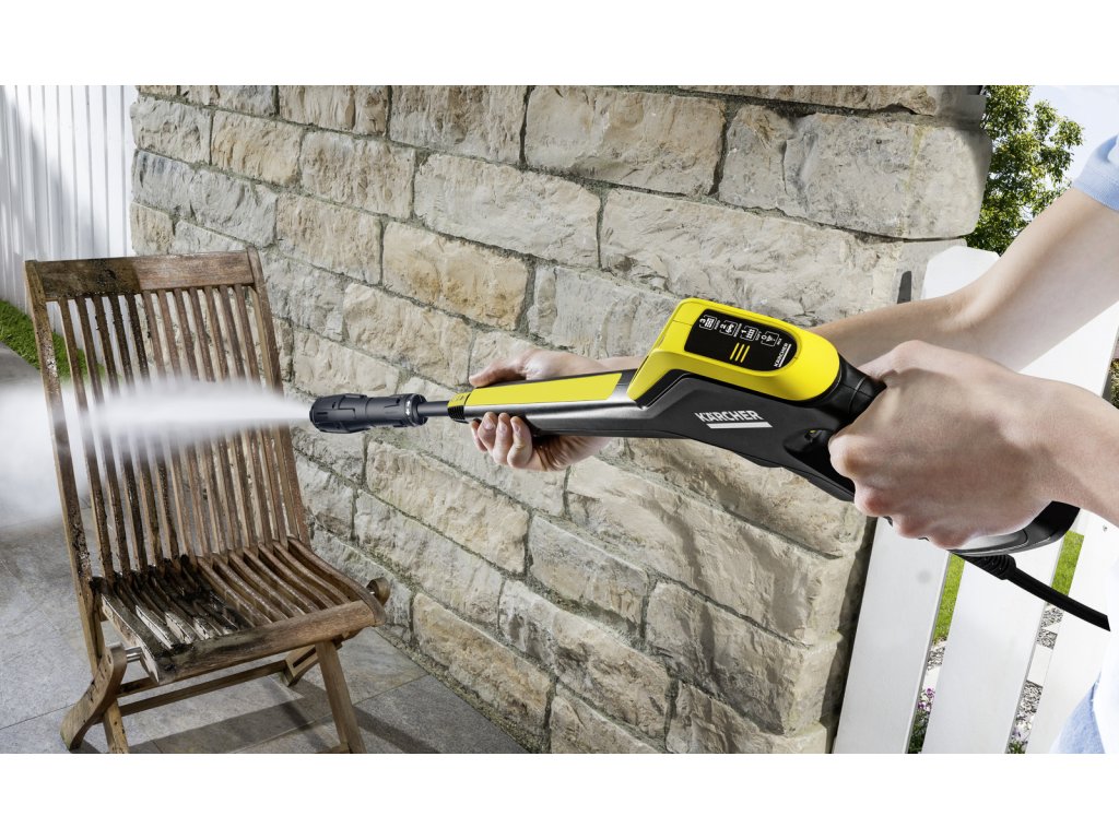 Dva štandardné pracovné nadstavce a trojstupňová regulácia tlaku zabezpečia dokonalé čistenie v každej situácii. Jemný prúd vody šetrne opláchne záhradný nábytok, zatiaľ čo silný prúd s tlakom až 130 barov zmyje aj dlho usadené nečistoty. Konfiguráciu zariadenia možno sledovať na displeji tlakovej pištole.