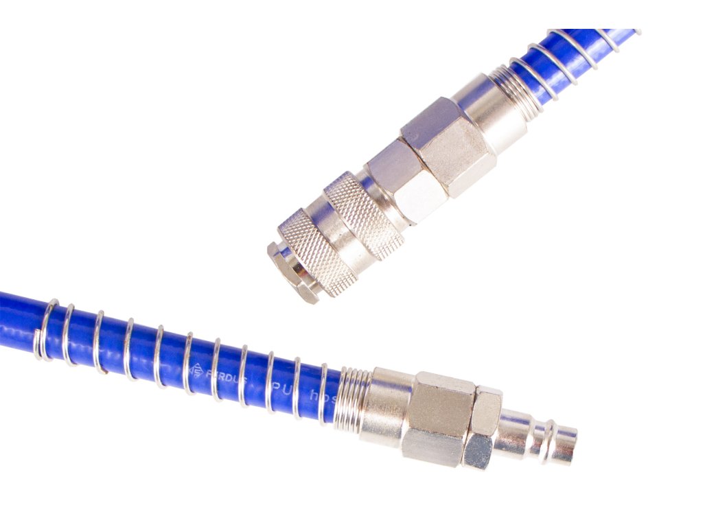 Hadice sú vybavené rýchlospojkami s ochrannými pružinami znižujúcimi nadmerné krútenie. Vďaka tomu je pripojenie vzduchového náradia (pneumatické uťahovače, račne, brúsky, vŕtačky, striekacie a ofukovacia pištoľ, pneuhustiče pod.) Veľmi rýchle a jednoduché. Mäkký polyuretánový povrch znižuje možnosť poškriabaniu povrchu.