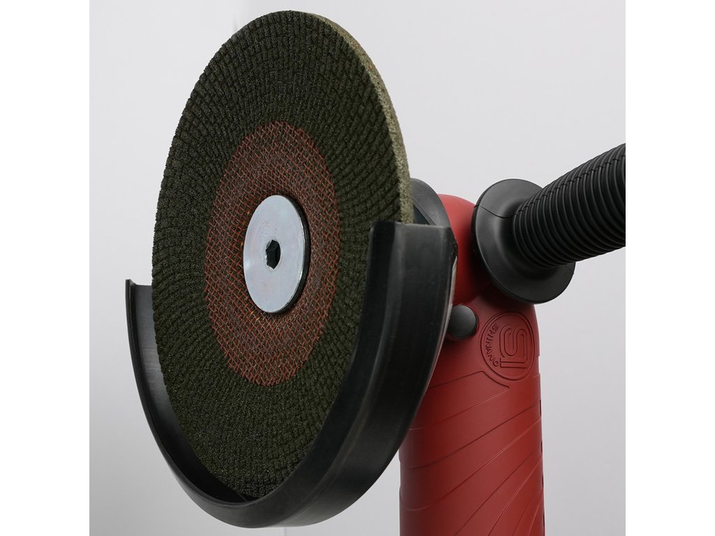 Brúska je navrhnutá s ohľadom na vysokú bezpečnosť práce: spúšť je vybavená bezpečnostným zariadením, ktoré zabraňuje náhodnému spusteniu nástroja, brúsny/rezný kotúč je chránený robustným kovovým krytom proti odletujúcim iskrám alebo malým časticiam.