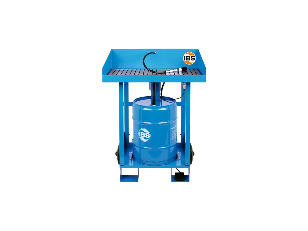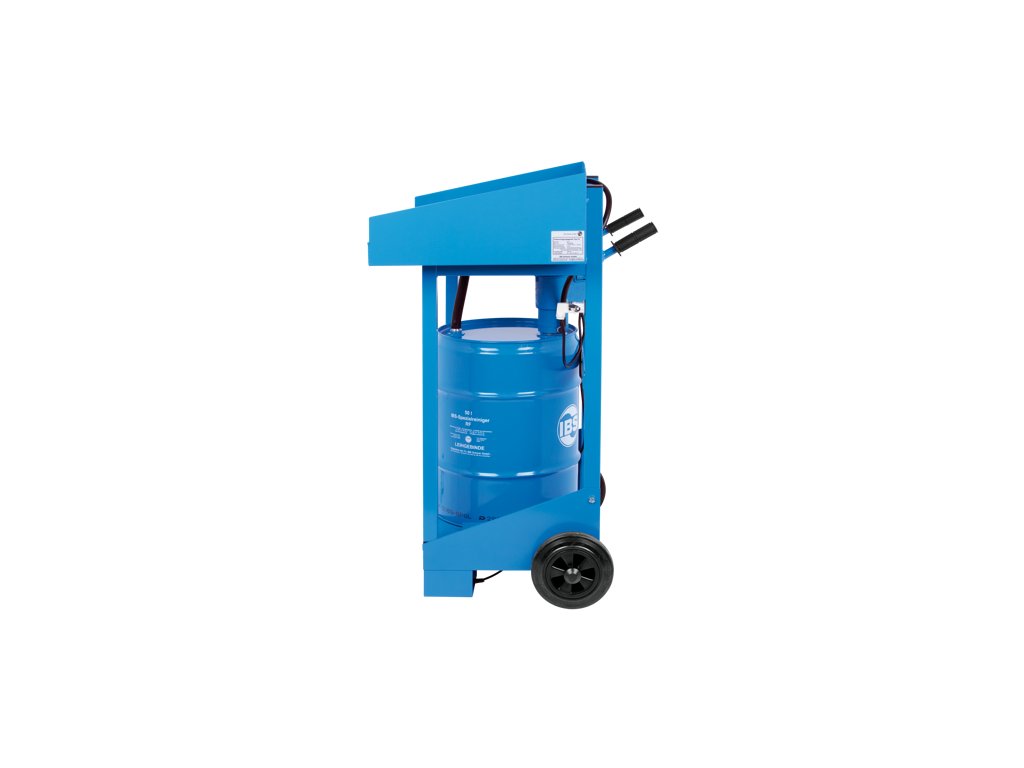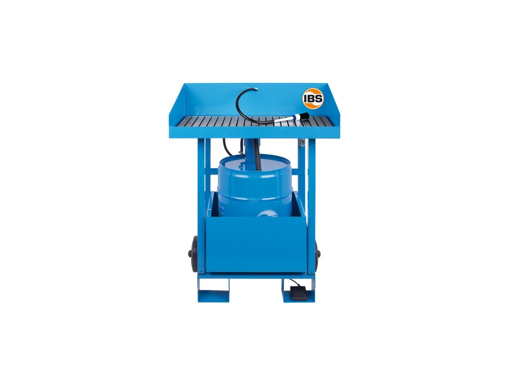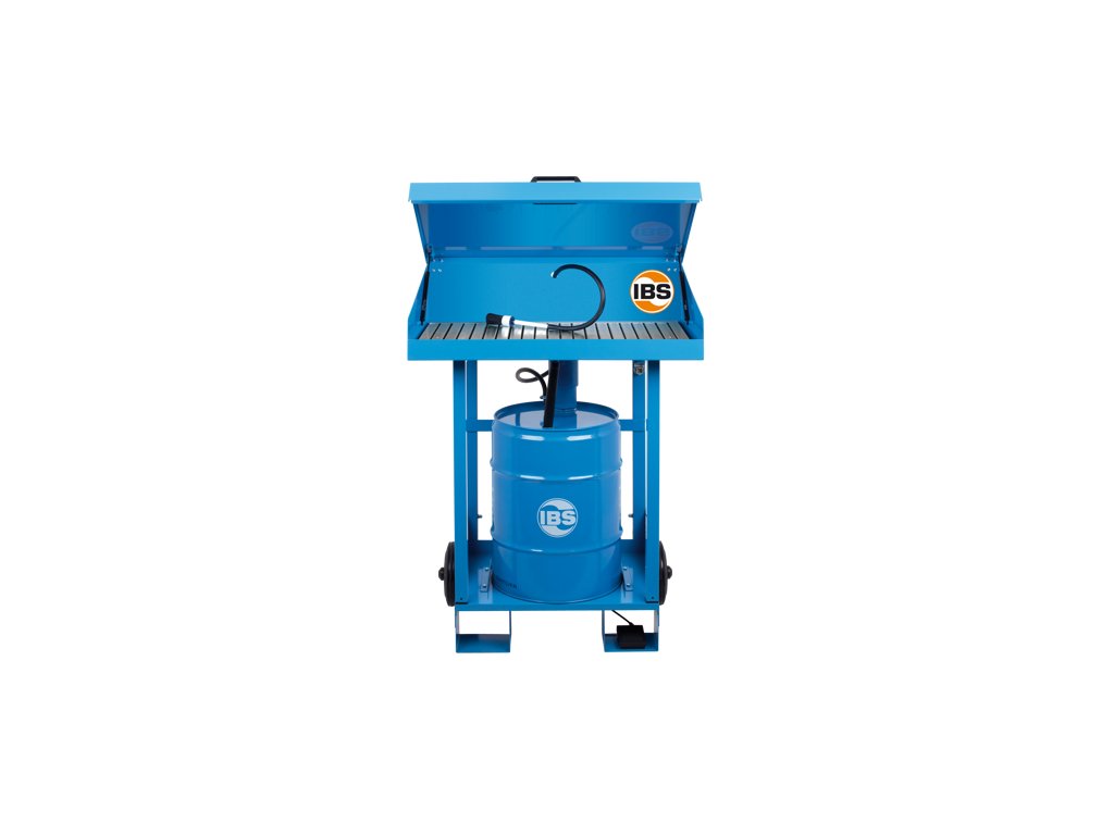 Pojazdný (mobilný) umývací stôl na čistenie dielov, s elektrickým čerpadlom ovládaným pedálom a prietokovým štetcom, kompaktné rozmery, pre 50-litrový sud – IBS Scherer 2120018