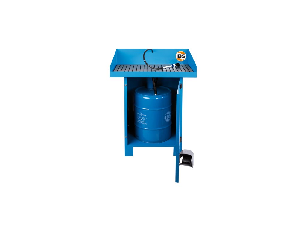 Umývací stôl na čistenie dielov, s elektrickým čerpadlom ovládaným pedálom a prietokovým štetcom, nosnosť 0,15 tony, pre max. 50-litrový sud – IBS Scherer 2120008