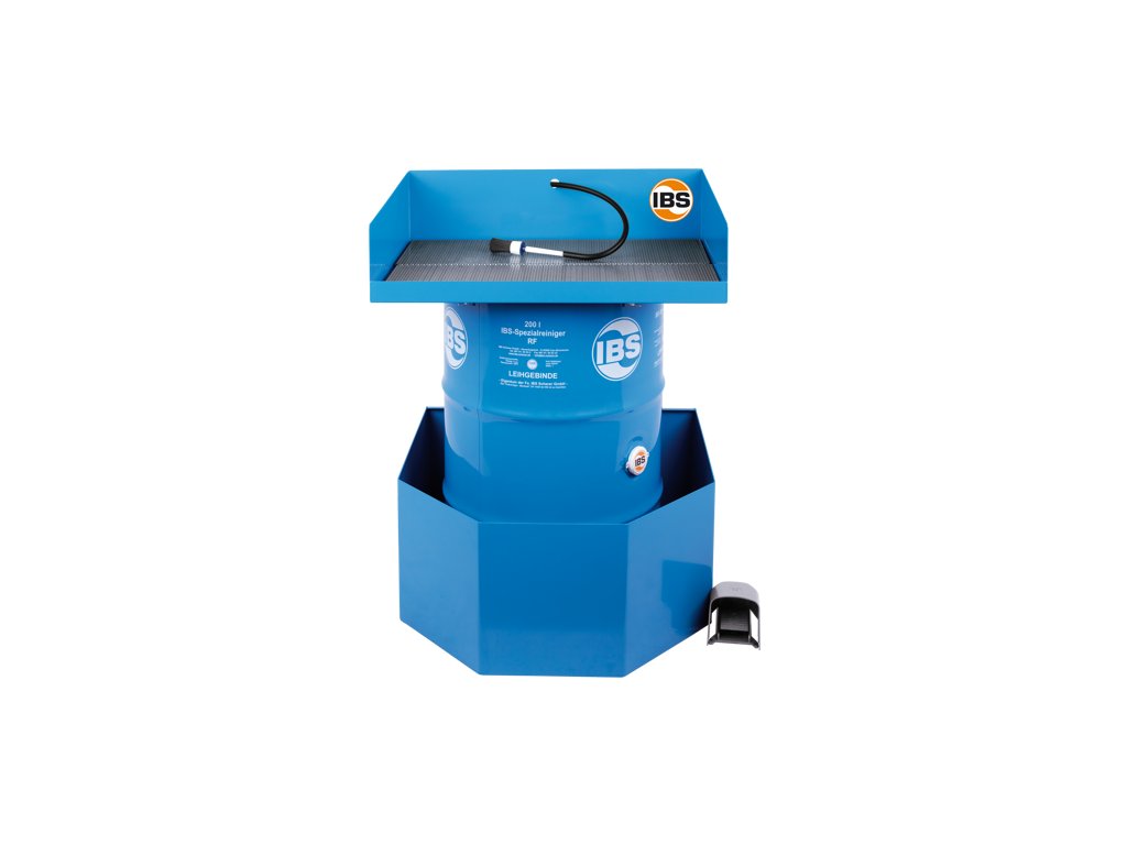 Umývací stôl na čistenie dielov, s elektrickým čerpadlom ovládaným pedálom a prietokovým štetcom, nosnosť 0,08 tony, pre max. 200-litrový sud – IBS Scherer 2120020