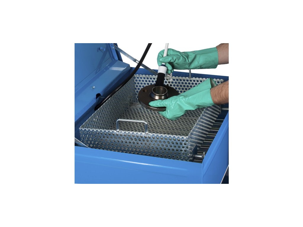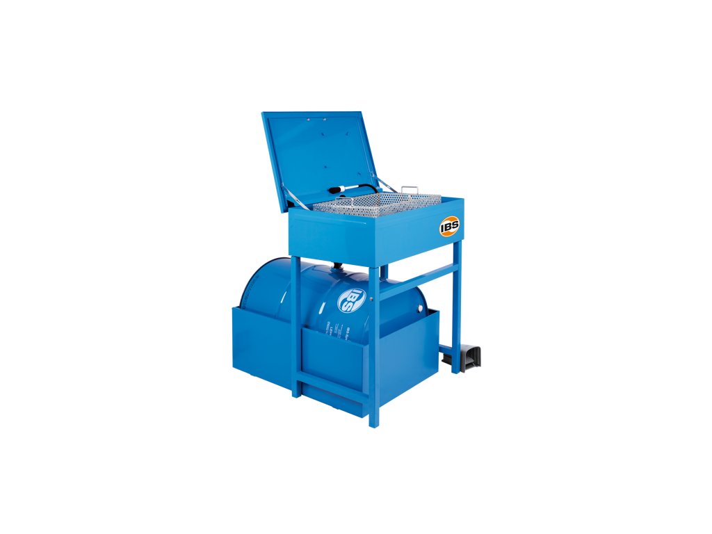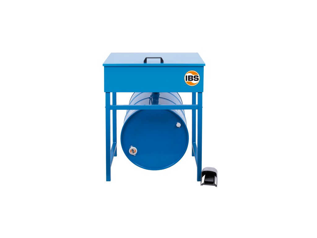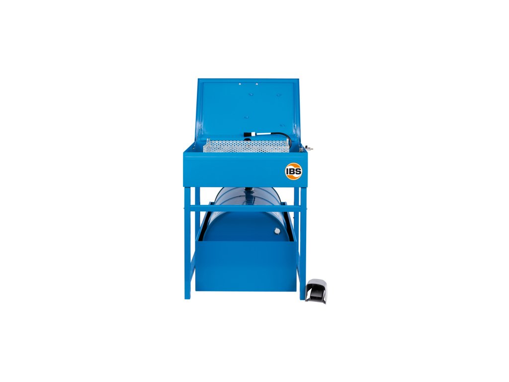 Umývací stôl na čistenie dielov, s elektrickým čerpadlom ovládaným pedálom a prietokovým štetcom, nosnosť 0,06 tony, pre max. 200-litrový sud – IBS Scherer 2120019
