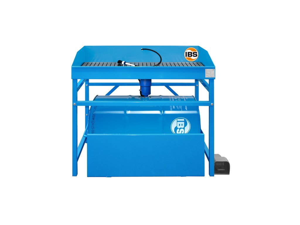 Umývací stôl na čistenie dielov, s elektrickým čerpadlom ovládaným pedálom a prietokovým štetcom, nosnosť 0,5 tony, pre max. 200-litrový sud – IBS Scherer 2120404