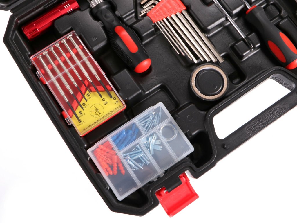 Sada obsahuje základné elektrikárske náradie, račňu, baterku, kliešte, kladivo, meter, vodováhu, širokú škálu bitov a nástrčiek a mnoho ďalšieho. Súčasťou je aj množstvo užitočného spojovacieho materiálu.