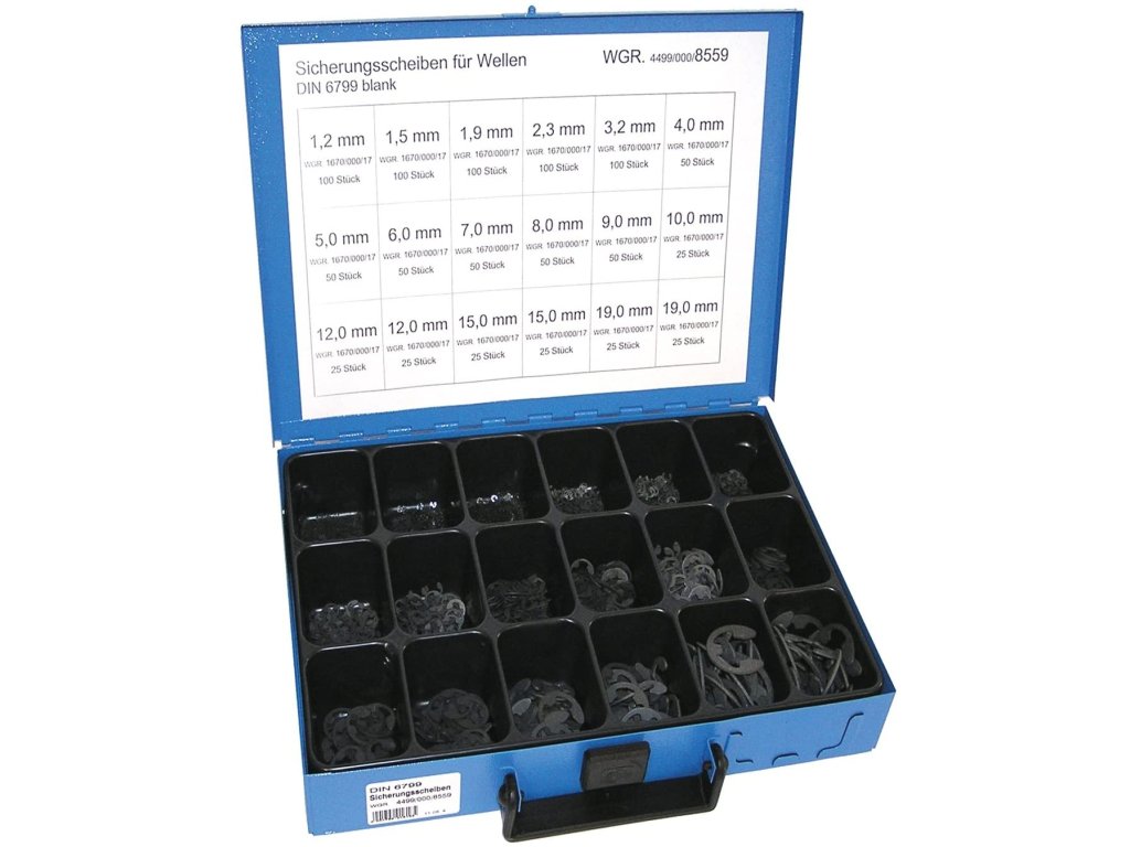 Poistné krúžky strmeňové DIN 6799, pre hriadele s drážkou 1,2-19 mm, súprava 975 ks v kufri