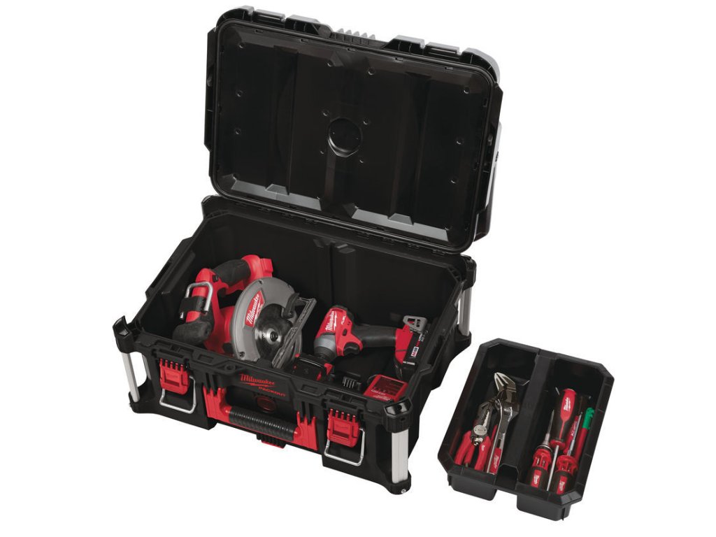 Veľký a pevný organizér na prenášanie a skladovanie menších aj väčších kusov náradia. Do hlavného úložného priestoru je možné dať napr. vŕtačky, uťahovače a pod., vyberateľná priehradka s rukoväťou poslúži napr. na uloženie kľúčov, skrutkovačov, klieští a pod.