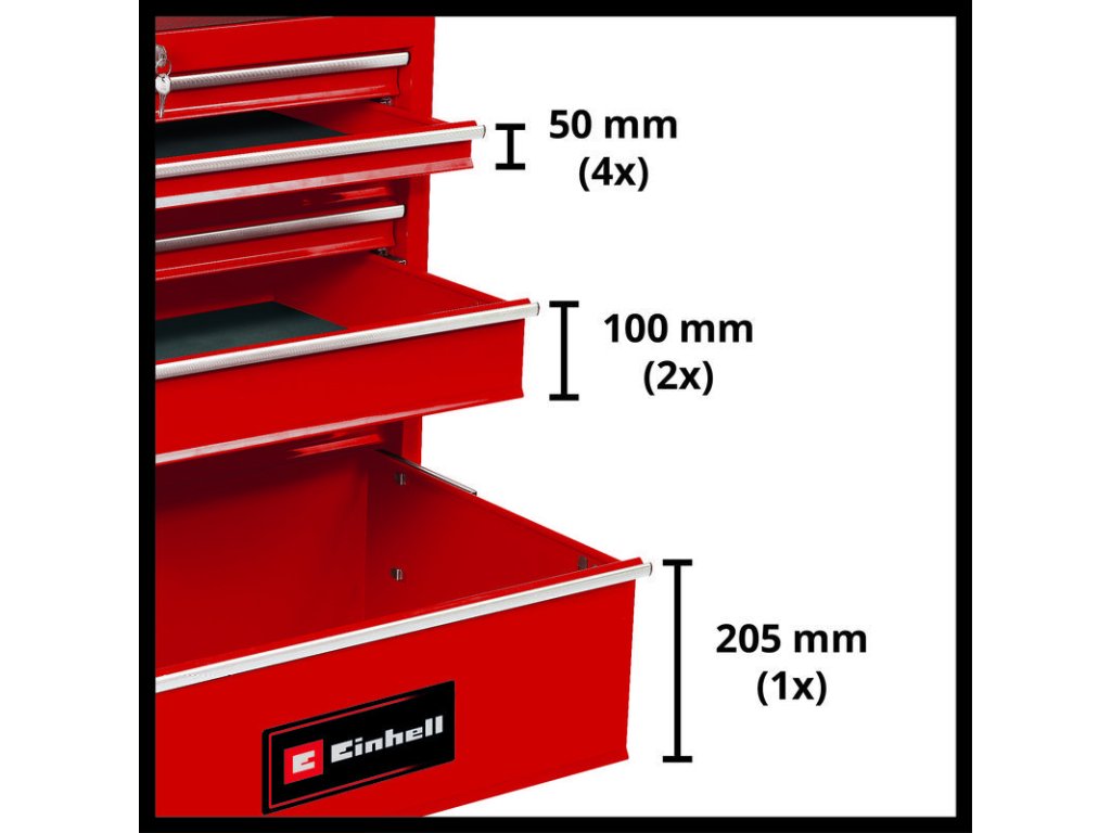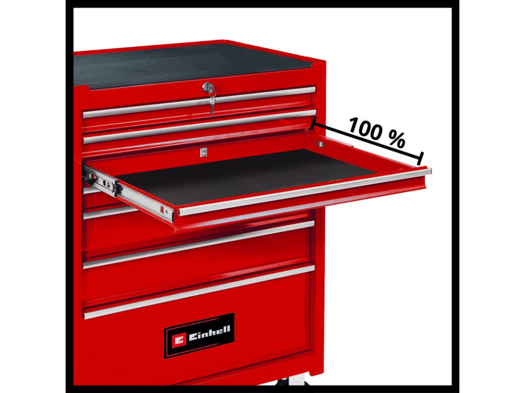 Sedem zásuviek s guličkovými ložiskami, ktoré sa dajú úplne vysunúť na svojich teleskopických koľajničkách, udrží všetko potrebné náradie na dosah. Všetky zásuvky majú protišmykové vložky a dajú sa uzamknúť. Praktický vozík unesie vďaka robustnému rámu z oceľového plechu až 150 kg nákladu. Vďaka protišmykovej pracovnej doske sa na vozíku pohodlne pracuje. Štyri veľké, hladko sa pohybujúce kolesá, z ktorých dve sú riadené a majú parkovaciu brzdu, umožňujú veľmi jednoduché a pohodlné presúvanie vozíka. Z bezpečnostných dôvodov je vozík na náradie vybavený výsuvnými zarážkami zásuviek, ktoré zabraňujú súčasnému otvoreniu viacerých zásuviek.