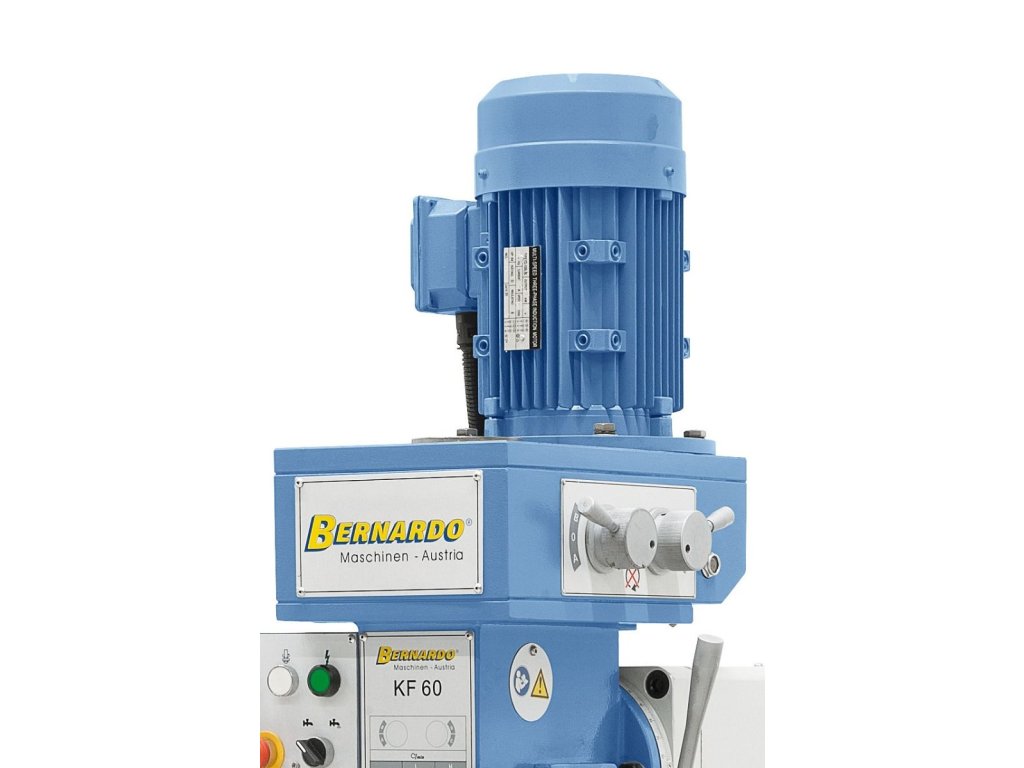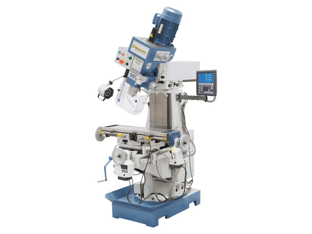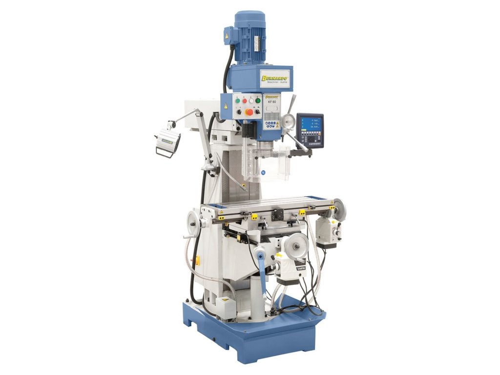 Kombinovaná stojanová (stĺpová) vŕtačka a fréza, elektrická 400 V, s digitálnym odmeriavaním pre 3 osi, naklápacím a natáčacím vrchným ramenom a chladením – Bernardo KF 60