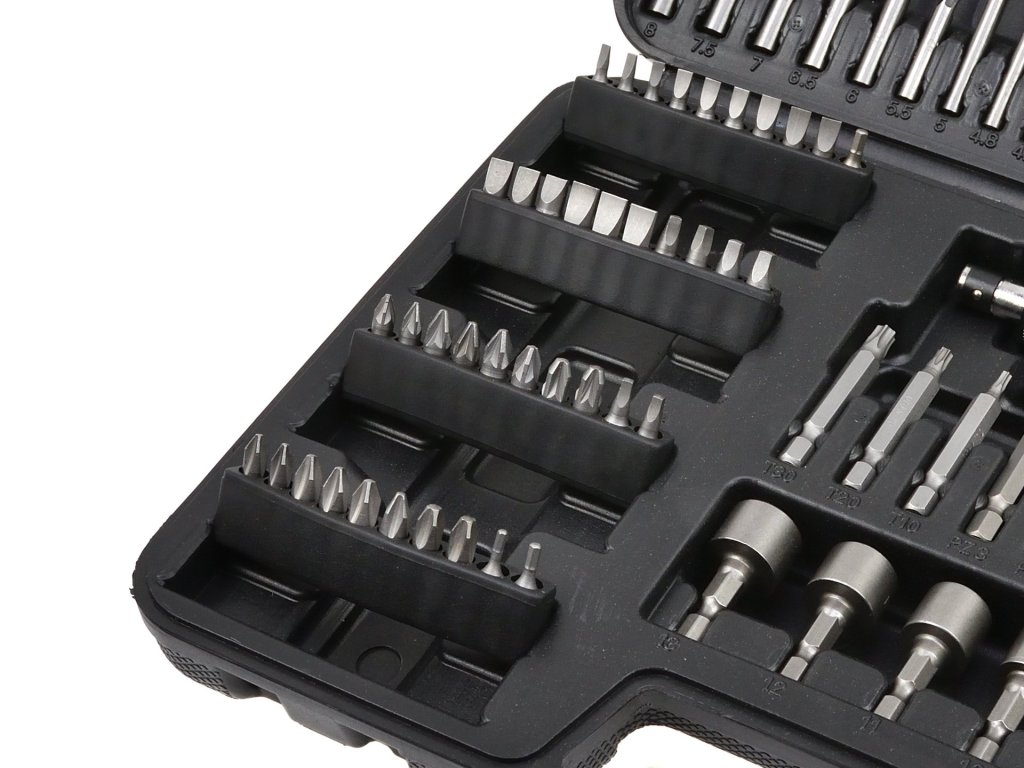 Prakticky poskladaná zostava náradia pre skrutkovanie a vŕtanie do rôznych materiálov. Vhodná pre autoservis, dielňu, domácnosť a mnohé ďalšie miesta.