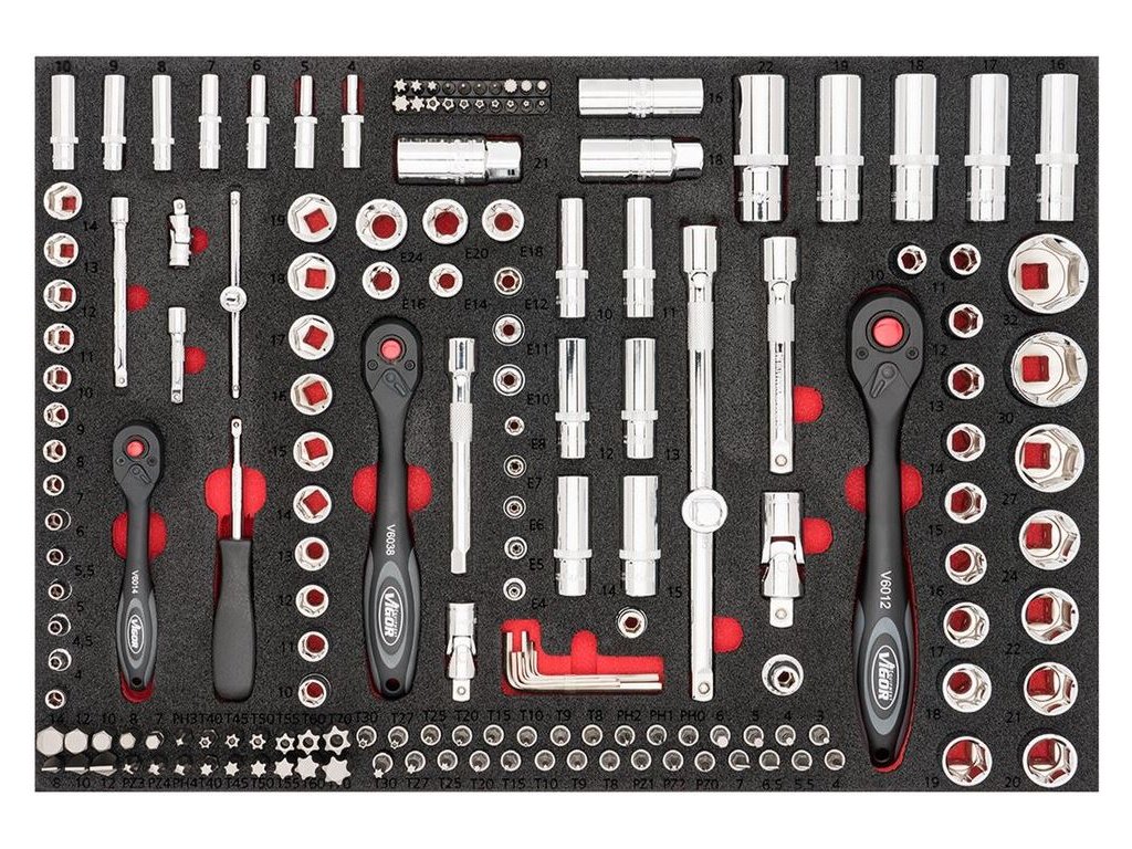 Veľmi kvalitný dielenský vozík s výbavou 248 kusov ručného náradia. Obsahuje moduly s gola sadami s vodiacimi 4hran rozmerov 1/4 "(hlavice 4-14 mm), 3/8" (hlavice 6-21 mm) a 1/2 "(hlavice 10-32 mm), skrutkovače, kliešte. kladivo, očkoploché, očkové vyhnuté a ploché otvorené kľúče.