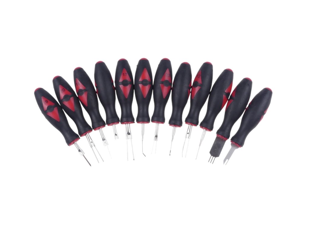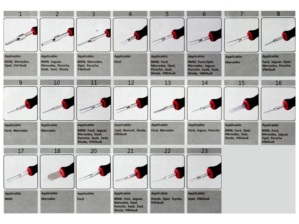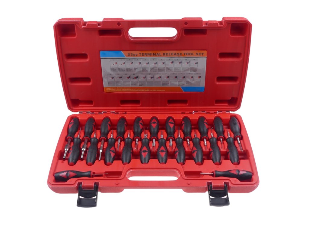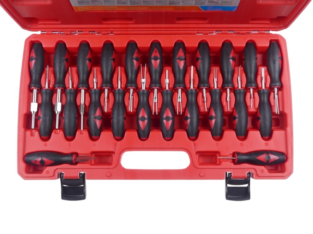 23-dielna sada pre jednoduché rozpojovanie konektorov pokrýva väčšinu typov vidlicových, plochých aj okrúhlych konektorov.
