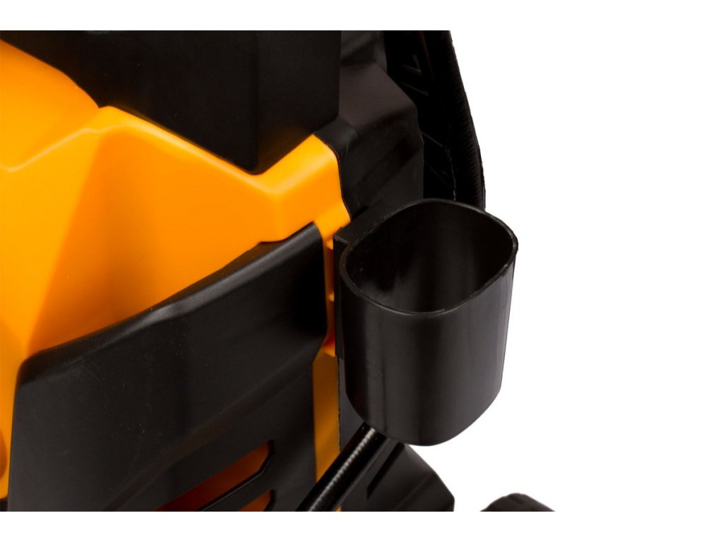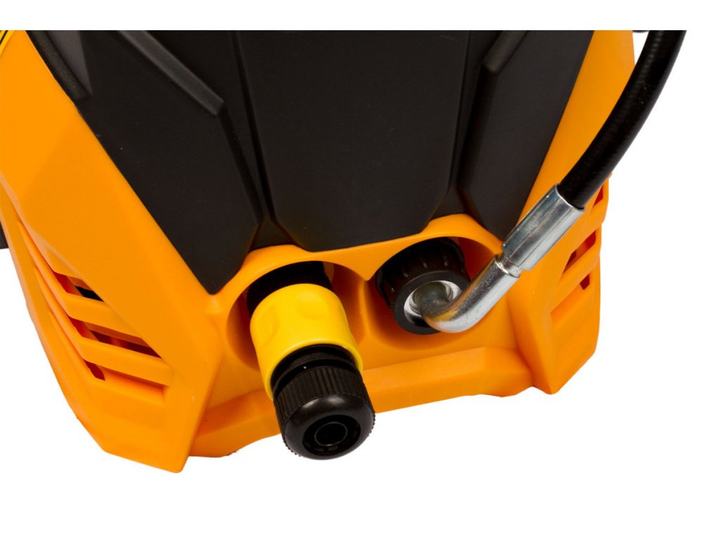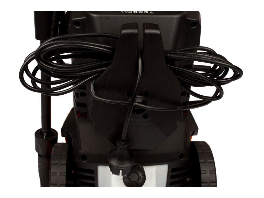 Na ľavom boku je vyvedený prívodný elektrický kábel o dĺžke 5 ma na pravom boku odkladaciu držiak vysokotlakovej pištole (iba pri kompletnom zapojení pištole). A u pätky sú na stranách transportné kolieska.