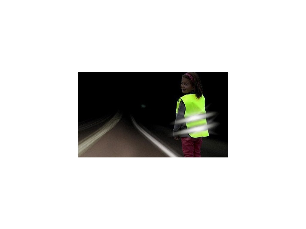 Vesta sa jednoducho nasadí cez hlavu dieťaťa tak, aby na prednej aj zadnej strane boli dobre viditeľné reflexné prvky.