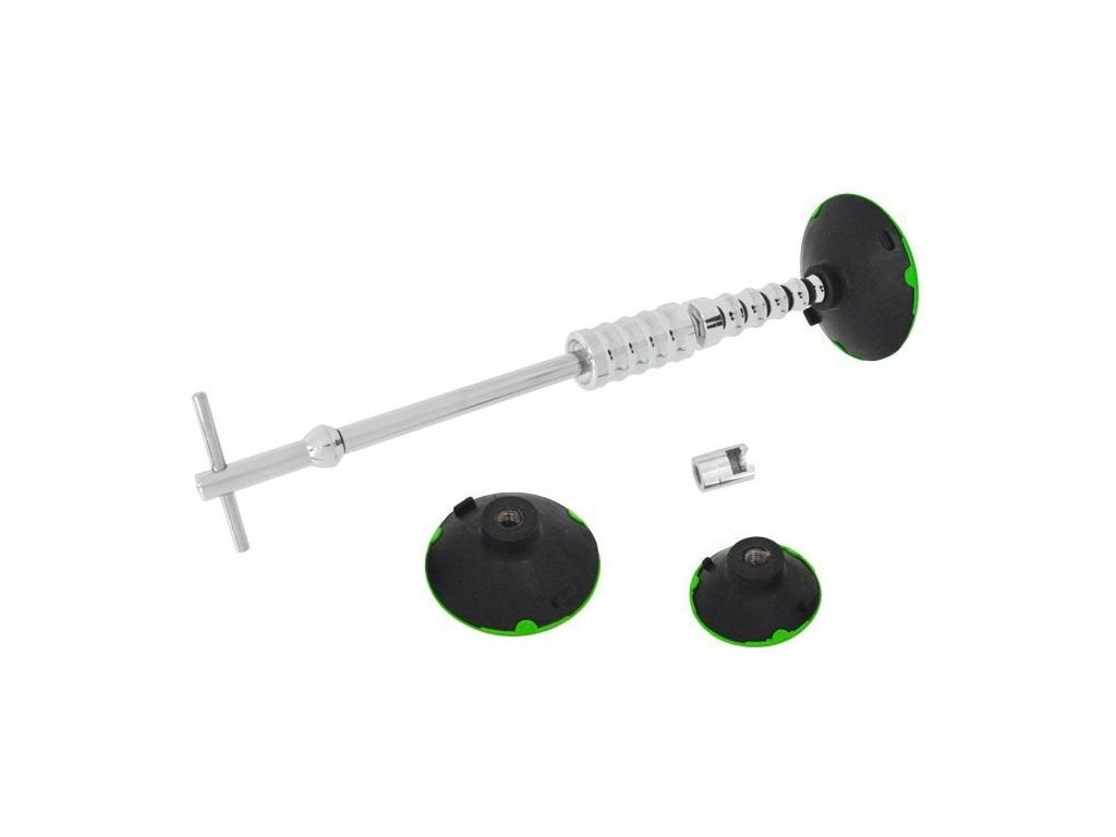 Klzné vyťahovacie kladivo 1570 g (sada) sa skrutkovacie koncovkou pre uchytenie nalepených vyťahovacích adaptérov pre odstraňovanie promáčklin karosérií a s 3 rôznymi prísavkami.