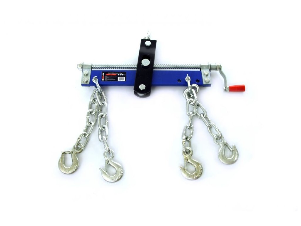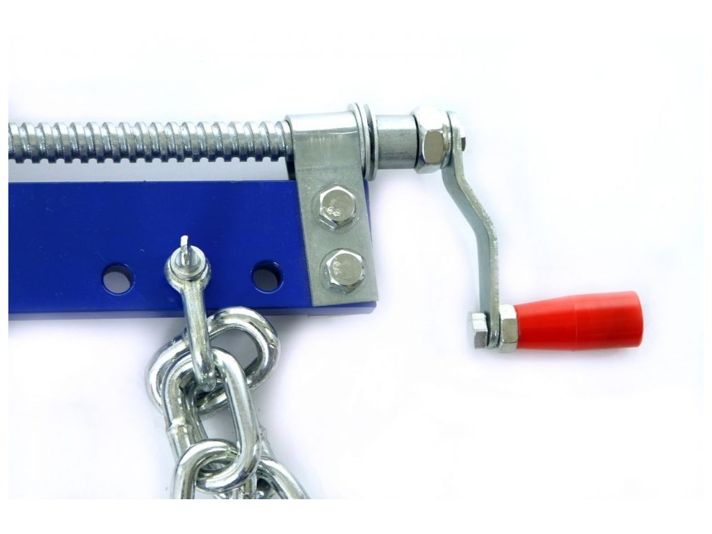 Kombinácia hriadeľa, posuvného nosníka, reťazí so závesnými hákmi a ručnej kľuky umožňuje bočné nastavenie sklonu a pohodlnú manipuláciu pri práci.