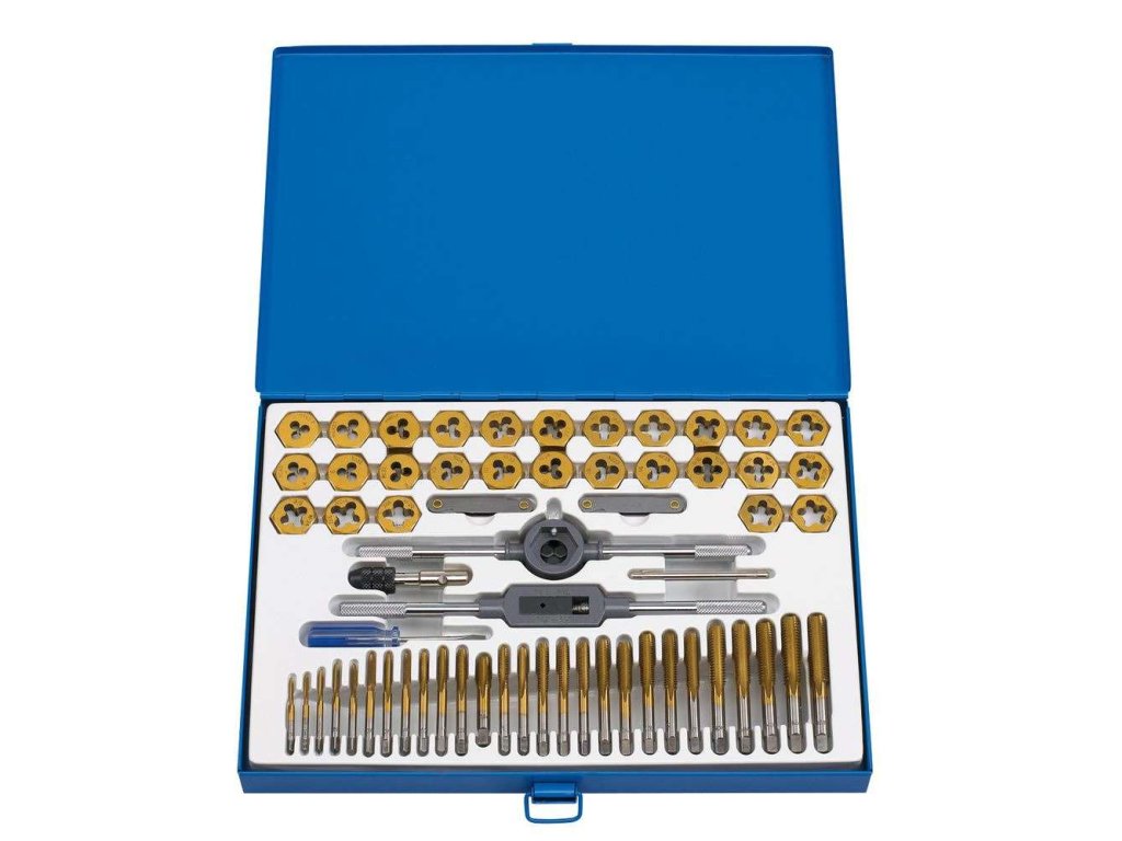 Závitníky a závitové očká (tzv. závitové čeľuste) na vyrezanie alebo opravu vnútorných i vonkajších závitov, súprava 60 dielov v plechovej kazete – Bernardo 431020