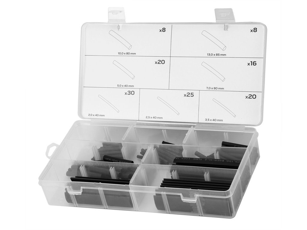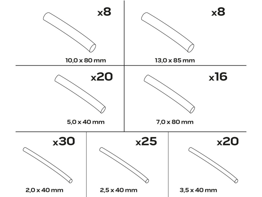 30 x (2,0 x 40 mm), 25 x (2,5 x 40 mm), 20 x (3,5 x 40 mm), 20 x (5,0 x 40 mm), 16 x (7,0 x 80 mm), 8 x (10,0 x 80 mm), 8 x (13,0 x 85 mm) Sada 127 zmršťovacích návlekov30 x (2.0 x 40 mm), 25 x (2,5 x 40 mm), 20 x (3,5 x 40 mm), 20 x (5,0 x 40 mm), 16 x (7,0 x 80 mm), 8 x (10,0 x 80 mm), 8 x (13,0 x 85 mm)