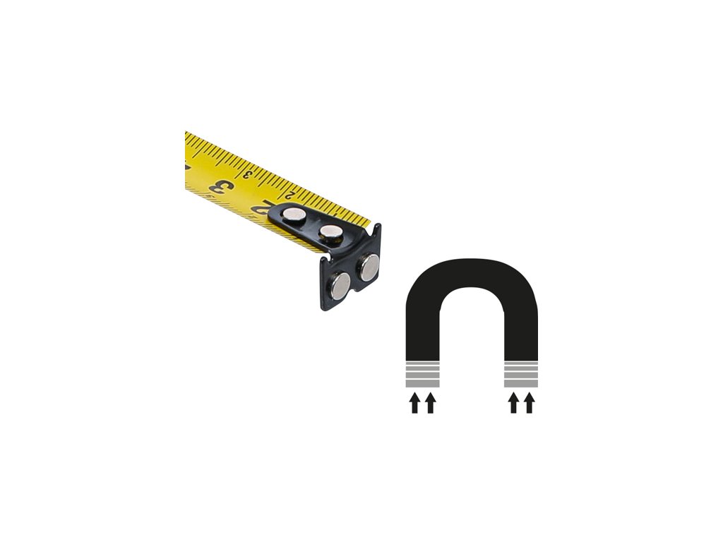 Žlto lakovaná pásová oceľ s povrchovou úpravou odolnou proti oderu je pružná a odolná proti pretrhnutiu. a milimetrovou stupnicou v čiernej farbe na hornom a dolnom okraji.