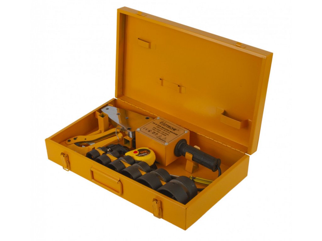 Polyfúzna dosková zváračka na plastové potrubie, výkon 1500 W, s termoregulátorom, so sadou nástavcov a príslušenstva v plechovom kufri – Hoteche